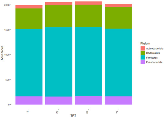 The predominant phyla within the 50 most abundant observational taxonomic units (OTUs) were Firmicutes (73%), Bacteroidetes (15%), Fusobacteria (8%), and Actinobacteria (4%, Table 3, Figure 3). The relative abundance of Firmicutes was numerically lower for T3 at 69% compared to the remaining treatments at an average of 74%. The relative abundance of Bacteroidetes was 13% for T1, 14% for T2, and 16% for both T3 and T4. The relative abundance of Fusobacteria was numerically greater for T3 at 11% compared to the remaining treatments at an average of 8%. The relative abundance of Actinobacteria was numerically lower for T4 at 3% compared to the remaining treatments at an average of 5%. However, the shifts in the predominant phyla among the dietary treatments were not significant (p > 0.05).