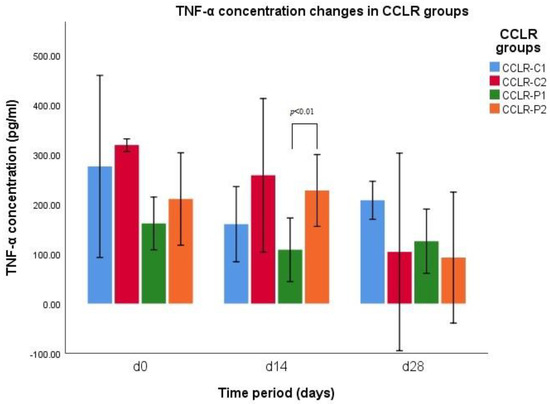 TNF−α concentration changes during different time periods (d0, d14, and d28) in CCLR−P and CCLR−C groups.