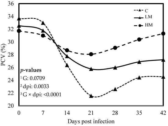Least square means of packed cell volume (PCV) of Creole kids according to the three experimental groups (C, Control; LM, Low Methionine; and HM, High Methionine) infected with an oral single dose of 10,000 third-larvae stage (L3) of Haemonchus contortus. 1 G: experimental groups, 2 dpi: days post infection, 3 G × dpi: interaction between G and dpi.