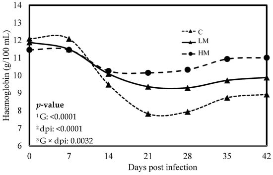 Least square means of hemoglobin concentration of Creole kids according to the three experimental groups (C, Control; LM, Low Methionine; and HM, High Methionine) infected with an oral single dose of 10,000 third-larvae stage (L3) of Haemonchus contortus. 1 G: Experimental groups of treatment, 2 dpi: days post infection, 3 G × dpi: interaction between G and dpi.