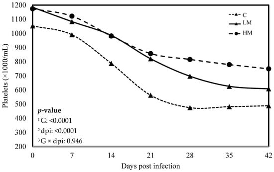 Least square means of platelet concentration of Creole kids according to the three experimental groups (C, Control; LM, Low Methionine; and HM, High Methionine) infected with an oral single dose of 10,000 third-larvae stage (L3) of Haemonchus contortus. 1 G: Experimental groups, 2 dpi: days post infection, 3 G × dpi: interaction between G and dpi.