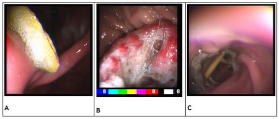 In the present study, the mean time spent for endoscopic extraction was 54.79 min (range, 10–120 min). Based on responses from veterinarians, Wood et al. (2021) defined a maximum time limit of 60 min for the retrieval of gastric EFBs and no time limit for the removal of esophageal EFBs, although the attempted removal should last at most 60 min []. Absence of a maximum time limit for the retrieval of esophageal EFBs depends on the need for surgical removal in the event of failure, except in cases where digestible material can be pushed into the stomach. The surgical removal of esophageal FBs has longer hospitalization and an increased risk of death in dogs []. The time spent on endoscopy depends on the difficultly of the extraction of the FBs, operator’s experience, and clinical conditions of the patients. A reduced time for endoscopy is useful for decreasing the time of anesthesia and improve the outcome in esophageal obstructions by FBs. Indeed, esophageal obstructions should be considered an emergency because of the higher the risk of necrosis, ulceration, and perforation of the esophageal mucosa, which can lead to pneumothorax, pneumomediastinum, or pyothorax if FBs remain for a long time [].