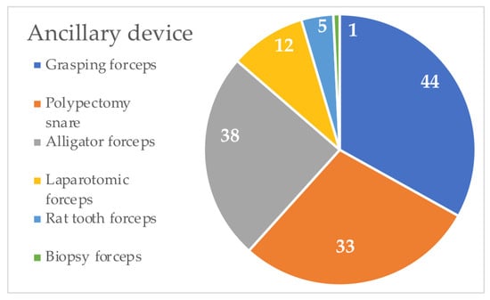 Endoscopy was used to successfully extract FBs in 88% (81/92) of animals (75/86 dogs (87.2%) and 6/6 cats (100%)). In 11/92 (12%) patients, surgical intervention was required to safely remove FBs. The operator’s experience was categorized as novice in 16 cases (17.3%), middle in 41 cases (44.5%), and expert in the remaining 35 cases (38.1%). For the removal, various ancillary devices were used, from a minimum of one to a maximum of three. In cats, multiple endoscopic instruments for removal were not used. In 56/92 cases (60.9%) only one ancillary device was used, and multiple instruments for the extraction were used in 36/92 cases (39.1%). Ancillary devices (polypectomy snare, rat tooth forceps, alligator forceps, grasping forceps, and biopsy forceps) were used within the working channel of the endoscope, whereas laparotomic forceps were used coaxially to the operating whip. Endoscopic instruments used during the retrieval of EFBs are summarized in Table 5 and Figure 2.