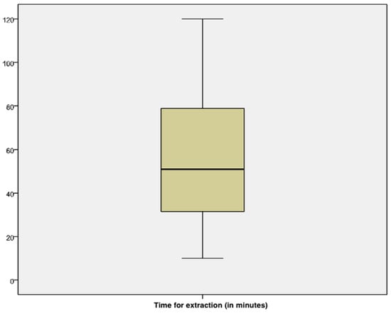 Mean time spent for removal was 54.79 min ± 2.44 with a minimum of 10 min and a maximum of 120 min (Figure 3). Time spent for the extraction was excellent in 22/92 cases (23.9%), good in 35/92 cases (38%), acceptable in 28/92 cases (30.4%), and unacceptable in 7 cases (7.6%).