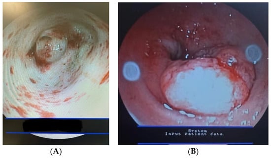 Main complications observed in dogs with esophageal FBs. (A). Thoracic esophagus—esophageal mucosa was characterized by 2–4 mm multifocal erosions/ulcerations and diffuse hemorrhages. (B). Cardia (thoracic esophagus)—esophageal mucosa shows edema, hyperemia, and hemorrhages. A 4 mm mucosal erosion/ulceration is evident.