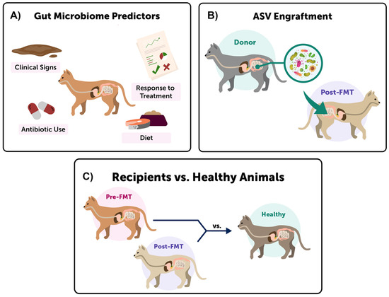 Three main fecal microbiome comparisons were conducted in this study. (A) We investigated shifts in the fecal microbiomes of FMT recipients by testing whether four host predictors were significantly associated with microbiome composition, alpha-diversity, and beta-diversity. (B) We identified which ASVs ‘engrafted’ in FMT recipients by comparing the fecal microbiomes of FMT recipients to those of their FMT stool donors, and determining which ASVs were shared. (C) Lastly, we examined whether the fecal microbiomes of FMT recipients became more similar to the microbiomes of healthy cats after FMT.