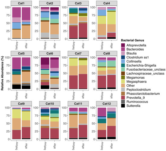 Fecal microbiome composition before and after FMT for twelve of the forty-six cats. Plots showing the relative frequencies of 16S rRNA gene sequences assigned to bacterial genera with mean relative abundances > 1.65%, while all other genera are clumped into an “Other” category. Twelve of the forty-six cats were selected at random for plotting. For plots of the microbiome compositions of all 46 cats, see Figure S1.
