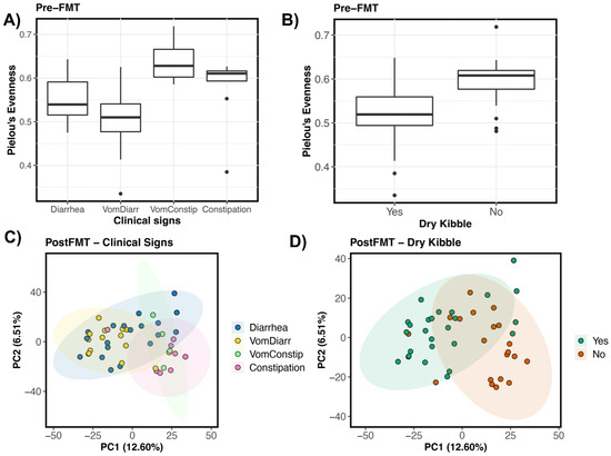 Host predictors of fecal microbiome alpha- and beta-diversity in FMT recipients. Boxplots of microbiome evenness (Pielou’s Evenness) by (A) clinical signs and (B) dry kibble consumption for pre-FMT samples. PCoA ordinations based on Aitchison distances showing the clustering of post-FMT samples by (C) Clinical signs, and (D) Dry kibble consumption.
