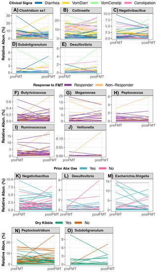 Changes in the relative abundances of bacterial genera in cats receiving oral FMTs. Linear mixed models indicated that the changes in the relative abundance of 10 bacterial genera were significantly associated with (A–E) host clinical signs, (F–J) response to FMT, (K–M) recent antibiotic use, or (N,O) dry kibble consumption. For the statistical output of post-hoc testing using Tukey linear contrasts, see Figure S4.