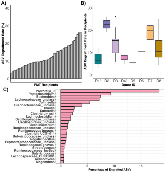 Another objective of our study was to compare the fecal microbiomes of FMT recipients with those of their donors to identify the bacterial ASVs that were more likely to be shared with or engraft in FMT recipients (Figure 1B). We also tested whether individuals varied in their ASV engraftment efficiency and correlated these values with host predictors. For this, we analyzed the ASVs that were shared between the fecal microbiomes of FMT recipients post-FMT and their specific stool donors, excluding any ASVs that were shared between the two groups pre-FMT. ASV engraftment rates indicated the proportion of donor ASVs that engrafted into FMT recipients relative to the total number of donor ASVs that had the capacity to engraft.