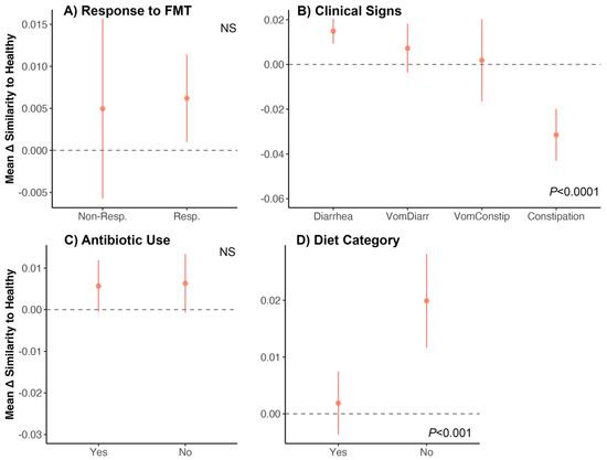 Lastly, we investigated whether the fecal microbiomes of FMT recipients two weeks after the conclusion of FMT became similar to those of age-matched and diet-matched individuals from the healthy reference set (Figure 1C). Perhaps there were groups of cats whose fecal microbiomes shifted closer to those of healthy cats compared to other groups of cats. For this, we computed the similarity between a cat’s preFMT microbiome and a fecal microbiome from the healthy reference set, and the similarity between a cat’s postFMT microbiome and that same healthy cat’s fecal microbiome. We then subtracted the two values (post—pre) to obtain (Δ) similarity for every FMT recipient—healthy animal dyad. This change in similarity (Δ) would indicate whether a cat’s fecal microbiome overall became more (if a positive value) or less (if a negative value) similar to fecal microbiomes from the healthy reference set.