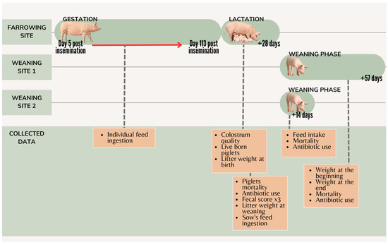 Reproductive data from each sow were also collected after the next reproductive cycle. The timeline of the study is represented in Figure 1.