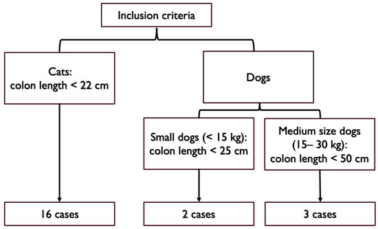 Partial colonic agenesis was defined as a colon length with at least a 15% reduction compared to the lowest values described in the literature for healthy dogs and cats [7,8,9].