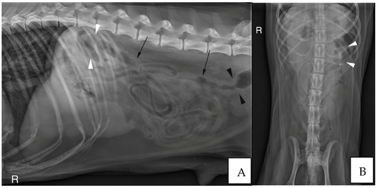 (A) Right lateral radiograph and (B) Ventro-dorsal radiograph of the abdomen of case 11, a six months old Scottish cat. The descending colon is shorter than expected and abruptly ends in the mid left abdomen (white arrow heads). No other parts of the colon are identified. R: Right.