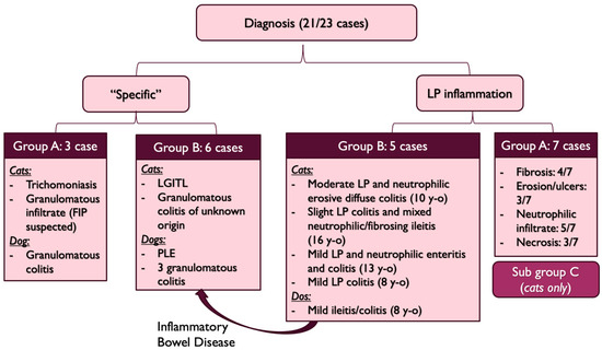 A concurrent diagnosis was established in all the cases in Group B and comprised one low grade intestinal T-cell lymphoma in a cat (LGITL), one protein-losing-enteropathy in a dog (PLE) and four granulomatous colitis. In the five remaining cases, a non-specific, mild-to-moderate lymphoplasmacytic infiltrate was present and was considered secondary to an inflammatory bowel disease (IBD) based on an exclusion diet.