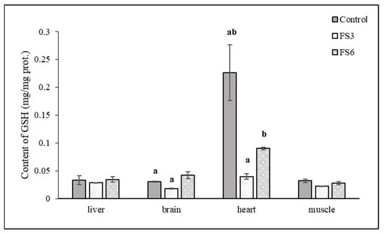 | Heart | U·mg prot.−1 | 0.178 ±0.042 ab | 0.032 ± 0.001 a | 0.063 ± 0.005 b |