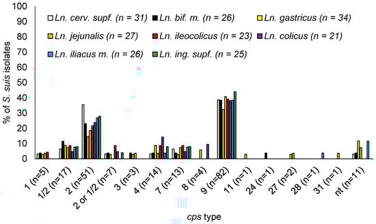 In the lymph nodes (n = 213), cps 9 occurred most frequently, with a relative proportion of 38.5% (n = 82), followed by cps 2 with 23.9% (n = 51). In descending frequency, cps 1/2, 4, 7, and 1 followed. While eleven lymph node isolates (5.2%) were non-typable, seven isolates (3.3%) could not be distinguished into cps type 2 or 1/2. The proportion of cps types in S. suis isolates from different lymph nodes showed the same distribution as in all tested sites (Table S4). The percentage distribution of cps types in the different lymph nodes is shown in Figure 3.