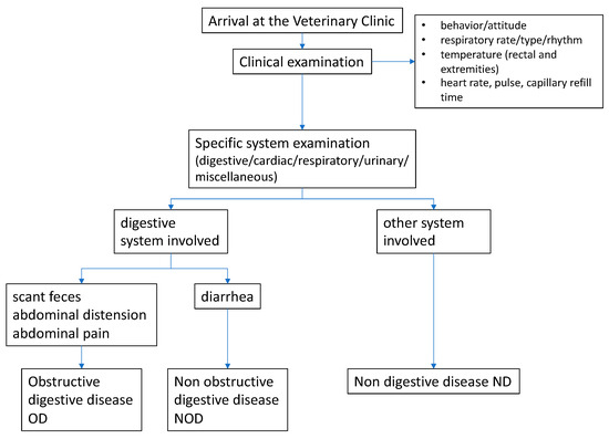 Calves were divided into 3 categories according to their underlying condition: non-obstructive digestive disease (NOD), obstructive digestive disease (OD), and non-digestive disease (ND). Obstructive digestive diseases were suspected when calves showed abdominal pain, abdominal distension, and scant feces (Figure 1).