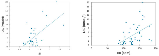 The Spearman correlation test showed a significant linear correlation between lactate concentrations and heart rate (r = 0.570; p < 0.05), and the shock index (r = 0.373; p < 0.05, respectively) (Figure 2).