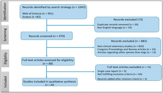 A total of 1043 records were initially identified from Scopus (n = 82) and Web of Science (n = 961). Exclusions were made for 39 records due to duplicate citations and 34 records for being in a non-English language. Among the remaining 970 records, 882 were excluded for various reasons: non-clinical veterinary studies (n = 859), incomplete studies, and review articles (n = 10), as well as studies related to species other than dogs (n = 13). Following the assessment of 88 full-text articles for eligibility, 73 records were excluded due to being single-case reports or not reporting conditions associated with the development of AF. Additionally, 5 articles were added after searching for citations not captured in the initial search. Consequently, our systematic review includes 20 studies involving 2,359,275 dogs, of which 4807 had spontaneously occurring AF.