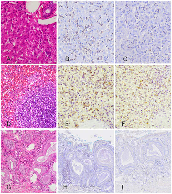 The spleen, gallbladder, and liver biopsy samples were subjected to histopathological evaluation and reviewed by a board-certified veterinary anatomic pathologist (Dipl. ACVP) (Figure 2). Hematoxylin-eosin (H and E) staining of multiple sections of the spleen revealed diffuse mild congestion, a few lymph follicles, an enlarged red pulp, mild-to-moderate extramedullary hematopoiesis, and a mixture of lymphocytes, macrophages, and blood components (Figure 2D). The lymph follicles were relatively small, consisting mainly of small lymphocytes equivalent in size to 1 to 1.5 erythrocytes, with less than one mitotic figure per high magnification field (0.237 m2). The destruction of tissue architecture in the spleen was not evident. H and E staining of multiple gallbladder sections revealed that the gallbladder mucosa was mildly hyperplastic, with mild infiltration of inflammatory cells, mainly small lymphocytes and plasma cells, in the lamina propria (Figure 2G). H and E staining of multiple liver sections revealed mild atrophy of the hepatic lobules with multifocal random loss of hepatocytes, infiltration of a moderate number of small lymphocytes and fewer neutrophils, and mild destruction of the hepatic lobular architecture (Figure 2A). Immunohistochemical staining was performed for CD3, CD20, and granzyme B using the following antibodies: a mouse anti-CD3 polyclonal antibody (Dako, rabbit polyclonal, Santa Clara, CA, USA, 1:200), rabbit anti-CD20 polyclonal antibody (Thermo Scientific, rabbit polyclonal, Cheshire, UK, 1:400), and rabbit anti-granzyme B polyclonal antibody (Abcam, rabbit polyclonal, Tokyo, Japan, 1:100) for the spleen, liver, and gallbladder. Hepatic immunohistochemistry revealed that most of the small lymphocytes were cytoplasmically positive for CD3 and granzyme B (Figure 2B,C) and negative for CD20. A splenic immunohistochemistry revealed that approximately 50% of the small lymphocytes scattered in the red pulp were positive for CD3 and granzyme B (Figure 2E,F). A gallbladder immunohistochemistry revealed that approximately 30% of the small lymphocytes in the lamina propria were positive for CD3 but negative for granzyme B (Figure 2H,I). A PCR for antigen receptor gene rearrangement (PARR) analysis was performed at the University of Tokyo following the method described previously [3] to examine the clonal rearrangement of immunoreceptor genes in liver cytology specimens. Monoclonal rearrangements of the T-cell receptor ɤ (TCRɤ) chain gene were detected, but no clonal patterns indicating immunoglobulin heavy chain (IgH) gene rearrangements were found. The diagnosis was atypical HSTCL predominately composed of sGLs concurrent with lymphocytic cholecystitis and mild gallbladder mucocele because a blood smear examination showed no lymphocytosis, no appearance of sGLs, and no neoplastic lymphocytes morphology suggestive of chronic lymphocytic leukemia–large granular lymphocytic leukemia (GL–CLL). Based on the mitotic figures, the HSTCL of this case is histologically low-grade [11].