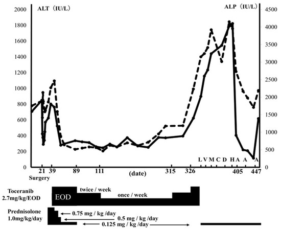After surgery, a chemotherapeutic agent sensitivity examination (CASE) [12,13,14] was performed at a commercial laboratory (Airdec mini, Tokyo, Japan) using liver biopsy tissue. Postoperatively, trepibutone (1 mg/kg, q12h) (SUPACAL; OHARA Pharmaceutical Co., Ltd., Shiga, Japan) was started. By day 22, T-BiL concentration (0.2 mg/dL) had normalized, and by day 25, CRP (0.3 mg/dL) had also normalized. However, starting from day 26, ALT and ALP levels began to rise (ALT; 341 IU/L, ALP; 1673 IU/L), prompting the initiation of prednisolone (1 mg/kg, q24h) (KYORIN Pharmaceutical, Tokyo, Japan). However, by day 39, ALT and ALP levels (ALT: 802 IU/L, ALP: 2267 IU/L) had further increased (Figure 3). On day 39, toceranib (2.7 mg/kg, per os (PO) every other day, administered four times a week) (Palladia®; Zoetis, Tokyo, Japan) as chemotherapy was started, based on the result of CASE (Table 2). We informed the owner in advance that toceranib has not been reported to be used for canine HSTCL so far, and thus, the effectiveness of toceranib is unclear for canine HSTCL. Subsequently, the owner agreed to use toceranib as a chemotherapeutic agent. ALT and ALP quickly decreased after the start of toceranib administration (Figure 3). Prednisolone was stopped on day 89. However, because of mild neutropenia (1.68 × 103/µL, RI: 2.95–11.64 × 103: grade 1 according to the Veterinary Cooperative Oncology Group-Common Terminology Criteria for Adverse Events) [15] observed with toceranib, the dose was tapered from four times a week to twice a week (2.7 mg/kg/day), and then further to once a week (2.7 mg/kg/day) (Figure 3). Although ALT and ALP levels were slightly elevated at the lowest dose (2.7 mg/kg/day once per week), no changes in clinical presentation were observed. An abdominal ultrasound revealed no changes in liver echogenicity, no appearance of mass lesions, and no signs of further organ invasion on day 305 compared to the initial presentation. The dog remained in good condition, and ALT and ALP levels were 395 IU/L and 1185 IU/L, respectively (Figure 3). However, on day 326, the dog exhibited abdominal distention, and abdominal ultrasonography revealed mild anechoic peritoneal effusion, and the ALT and ALP values were elevated to 622 IU/L and 2234 IU/L, respectively (Figure 3). The peritoneal effusion was characterized as a high-protein transudate (total protein: 4.5 g/dL) with a cell count of <5000/µL and low numbers of sGLs (1% of nucleated cells), which were morphologically similar to those noted in liver cytology during surgery. Due to concerns regarding inadequate toceranib dosage, the toceranib dosage was adjusted to 2.7 mg/kg every other day for 2 weeks despite potential adverse events associated with chemotherapy. However, by day 341, the peritoneal effusion had significantly increased, and liver enzymes had risen further (ALT: 898 IU/L, ALP: 3150 IU/L) (Figure 3). Then, prednisolone was resumed at 0.125 mg/kg/day starting on day 341. L-asparaginase (400 U/kg, subcutaneous injection) (Leunase; Kyowa Kirin, Tokyo, Japan) was administered on day 341, vinblastine (2.0 mg/m2, intravenously (IV)) (Exal; Nippon Kayaku Co., Tokyo, Japan) on day 348, masitinib (11.1 mg/kg, PO, q24h) (Masivet®; AB Science, Paris, France) from day 355 to day 361, carboplatin (200 mg/m2, IV) (CARBOPLATIN; Nichi-Iko Pharmaceutical Co., Ltd., Toyama, Japan) on day 362, doxorubicin (30 mg/m2, IV) (ADRIACIN; SANDOZ Japan Co., Ltd., Tokyo, Japan) on day 383, and chlorambucil (2 mg/head, every other day, PO) (LEUKERAN; Aspen Pharmacare Australia, st Leonards, NSW, Australia) from day 398 until day 404 (Figure 3). However, there was no improvement in the peritoneal effusion; liver enzymes continued to increase, and diarrhea developed as a clinical manifestation. On day 405, the dog developed severe ascites, with ALT and ALP levels reaching 1822 and 3954 IU/L, respectively. ACNU (25 mg/m2, IV) (Nidran; Daiichi-Sankyo, Tokyo, Japan) was started on day 405. By day 426, the peritoneal effusion had decreased from severe to mild, and liver enzymes had decreased (ALT: 221 IU/L, ALP: 2167 IU/L). Additionally, the diarrhea had completely resolved. Subsequently, ACNU was administered twice, on days 426 and 447. However, on day 457, liver enzymes re-elevated (ALT: 618 IU/L, ALP: 2188 IU/L), and ascite accumulation worsened. Additionally, moderate thrombocytopenia (platelet count: 99 × 103/µL, RI: 148–484 × 103/µL) and regenerative anemia (packed cell volume 25.4%, RI: 37.3–61.7%; reticulocytes 342.1 × 103/µL, RI: 10–110 × 103/µL) were newly diagnosed. On day 460, the patient developed respiratory distress and died. The owner declined an autopsy, and the cause of death was not determined.