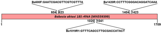 Schematic representation of the DNA-binding regions for the primers Ba600F, Ba1420R, and Ba1019R1 selected for the detection of B. aktasi by semi-nested PCR assay. The primer selection was based on multiple alignment results using the B. aktasi 18S rRNA gene sequence (MN559399) and various Babesia sequences registered in GenBank.