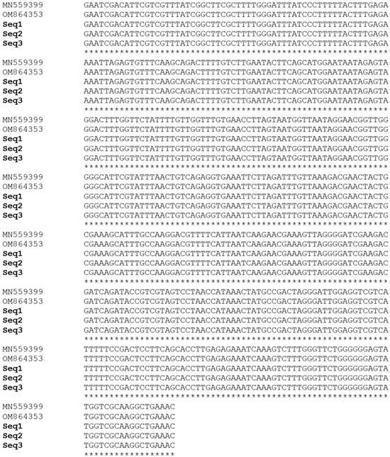 Multiple sequence alignment of three B. aktasi sequences (Seq1–3) obtained from the semi-nested PCR assay aligned with B. aktasi reference sequences (MN559399 and OM864353) available in GenBank.