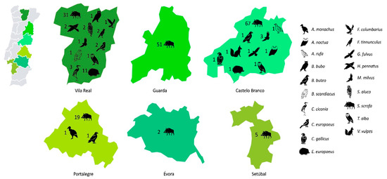 A map of Portugal showing the area of study (six districts) and the numbers and different species of animals sampled. The districts are not in scale.