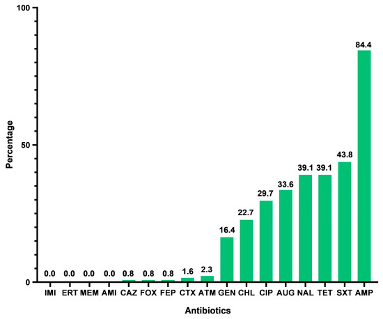 Percentage of antibiotic resistance in collection of 128 E. coli isolates. IMI—imipenem; ERT—ertapenem; MEM—meropenem; AMI—amikacin; CAZ—ceftazidime; FOX—cefoxitin; FEP—cefepime; ATM—aztreonam; CTX—cefotaxime; GEN—gentamicin; CHL—chloramphenicol; CIP—ciprofloxacin; AUG—amoxicillin–clavulanic acid; NAL—nalidixic acid; TET—tetracycline; SXT—trimethoprim–sulfamethoxazole; AMP—ampicillin.