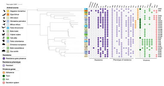 The identification of multiple phylogroups within the E. coli isolates indicates genetic diversity. The presence of strains belonging to phylogroups A, B1, D, and F aligns with the common phylogroups found in E. coli. Commensal strains usually belong to phylogroup A, phylogroup B1 is often found in environmental isolates, and phylogroups D and F may include both commensal and pathogenic strains depending on the specific strain’s virulence factors [61]. The isolate belonging to the phylogroup D was isolated from the species Gyps fulvus, which is a species that is exposed to diverse environments potentially harboring and spreading various bacterial strains. This animal was captured by the recovery center of CERAS but was not undergoing antibiotic treatment when the fecal sample was collected, which means it was part of the animal microbiota since no selective pressure was being induced. The circulation of pathogenic E. coli strains in the environment poses a zoonotic risk since such strains may infect livestock and humans or be transmitted from wildlife to livestock or human populations, particularly where vultures or other wildlife interact with human populations, farms, or urban environments. Furthermore, the phylogenetic tree showed a great genetic diversity between the 29 E. coli isolates, where some isolates detected on mammals were more genetically related to wild bird isolates. This suggests an interesting ecological context since the bacterial strains may be adapted to a specific ecological niche that is conducive to both wild mammals and wild birds. Also, the genetic relatedness may reflect a shared evolutionary history, indicating that these strains have a common ancestry that predates the divergence between these isolates.