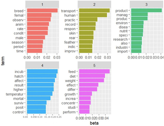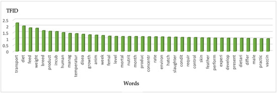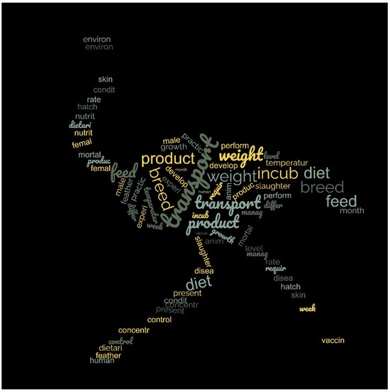 - Exclusion of uncommon characters (such as “@”, “/” or “*”), punctuations, numbers, and stop words (e.g., “the”, “a”, “and”, “on”, etc.). Also, words strictly connected with the examined topic or usually utilized, such as chick”, “protein”, “body”, “ratite”, “poultry”, “behaviour”, “bird”, “welfare”, “ostrich”, “farm”, “significant”, “group”, “well-being”, “test”, “animal”, were also removed. Extra white spaces resulting from preceding steps were also removed.