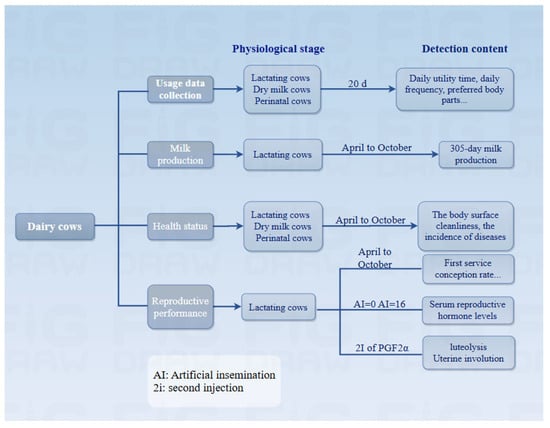The total number of Holstein dairy cows in the herd was over 2800. Among these cows, 48.1%, 14.9%, and 14.9% were lactating, dry, and perinatal cows, respectively. The experimental animals had an average 305-day milk production of 10,955 kg over a period, with an average of 3.27 parities. All dairy cows were housed in free pens, fed a total mixed ration, and given free access to feed and water. All pens were equipped with an exercise yard, with free access. Lactating cows prioritized feeding and water intake after milking, specifically during 6:00–7:00 AM, 2:00–3:00 PM, and 10:00–11:00 PM. Dry and perinatal cows prioritized feeding and water intake during 6:00–7:00 AM and 2:00–3:00 PM. During the test, the temperature, relative humidity, and temperature-humidity index (THI) were in the range of 0–39.5 °C, 17–99%, and 34–90, respectively. Animal facilities, herd management, and herd structure remained unchanged during the test. The test procedures are shown below (Figure 1).