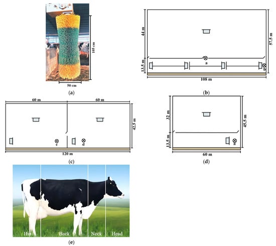 Experimental area, illustration of a mechanical brush, and the preferred body parts used by the cows. (a) Lactation livestock house size and installation locations of mechanical brushes. (b) Perinatal livestock house size and installation locations of mechanical brushes. (c) Dry milk livestock house size and installation locations of mechanical brushes. (d) Mechanical brush and its installation dimension. (e) The preferred body parts used by the cows. Note:
