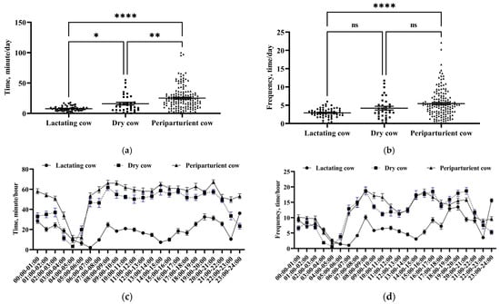 The daily utility time and frequency of usage of mechanical brushes by cows at different physiological stages. The daily utility time (a) and daily frequency of usage (b) of mechanical brushes for each cow. The daily utility time (c) and daily frequency of usage (d) of mechanical brushes at different time periods. The values in the chart are expressed as average ± standard error. ns indicates no significant change, * (p < 0.05), ** (p < 0.01) and **** (p < 0.0001) indicate significant differences.