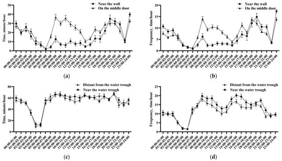 Effects of different installation locations on the duration and frequency of mechanical brush use in different physiological stages of dairy cows. (a) Utility time of mechanical brushes at different time periods in lactating dairy cows. (b) Frequency of usage of mechanical brushes at different time periods in lactating dairy cows. (c) Utility time of mechanical brushes at different time periods in perinatal dairy cows. (d) Frequency of usage of mechanical brushes at different time periods in perinatal dairy cows. The values in the chart are expressed as average ± standard error.