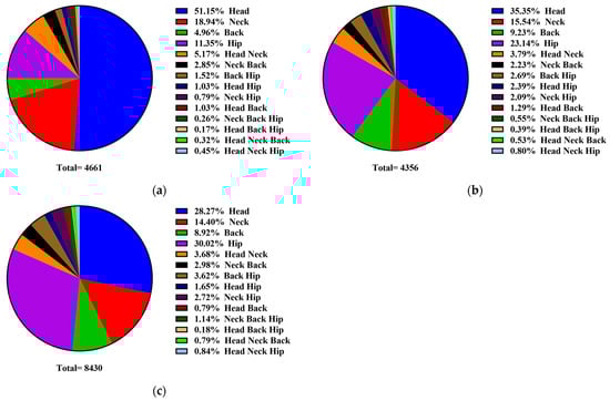 Figure 5 shows the statistical results of the preferred body parts used by the cows for grooming with mechanical brushes at different stages. During lactation, the main preferred body parts of the cows for grooming were the head (51.15%), neck (18.94%), and hip (11.35%), and the remaining body parts accounted for a smaller percentage (Figure 4a). For dry cows, the main preferred body parts for grooming were the head (35.35%), hip (23.14%), and neck (15.54%). In perinatal cows, the main preferred body parts for grooming were the hip (30.02%), head (28.27%), and neck (14.40%). Overall, when using mechanical brushes, the hip and head tended to be the main preferred body parts of dairy cows at different lactation stages.