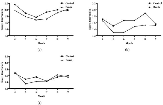 Effect of using mechanical brushes on the body surface cleanliness of dairy cows at different physiological stages. (a) Lactating dairy cows. (b) Dry dairy cows. (c) Perinatal dairy cows. The values in the chart are expressed as average.