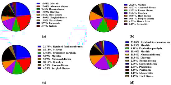 The incidence of diseases in dairy cows during the trial period. (a) Control group of lactating dairy cows. (b) Experimental group of lactating dairy cows. (c) Control group of perinatal dairy cows. (d) Experimental group of perinatal dairy cows.