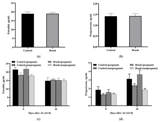 Figure 8a,b shows changes in the levels of reproductive hormones in the control and experimental groups on the day of the first AI. The experimental and control groups showed no significant changes in the concentrations of estradiol and progesterone.