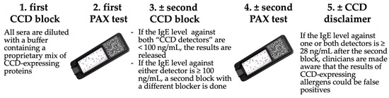 As CCD-specific IgE is known to cause false positive serological tests to pollen and plant food extracts [43], it is essential to eliminate such interference. As described in Section 2.2.3 above, the strategy used for CCD blocking in the ALEX2 was expanded in the PAX. Compared other IgE serological assays for veterinary use, a unique characteristic of the PAX is its inclusion of two “CCD detectors,” which are human proteins harboring different types of CCDs. These “CCD detectors” allow for a verification of the efficiency of the CCD blocking.