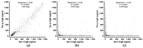 As would be expected between two strongly cross-reactive allergens, the IgE values specific for Der f 2 and Der p 2 were highly significantly correlated (Spearman r = 0.92; p < 0.0001; 1322 dogs; Figure 4a). Even though Der f 2 and Tyr p 2 are mite-group 2 allergens, they are expected not to cross-react much, and the correlation between their sIgE was significant but negative (Spearman r = −0.28; p < 0.0001; 5032 dogs; Figure 4b); this negative correlation indicates that dogs were generally sensitized to either one of these two allergens, but rarely to both. There was an even stronger negative correlation between levels of IgE to Der f 2 and Par j 2 (Spearman r = −0.49; p < 0.0001; 3249 dogs; Figure 4c). The latter two allergens are expected not to cross-react as they belong to different allergen sources (a mite versus a weed) and families (NPC2 versus nonspecific lipid-transfer proteins).