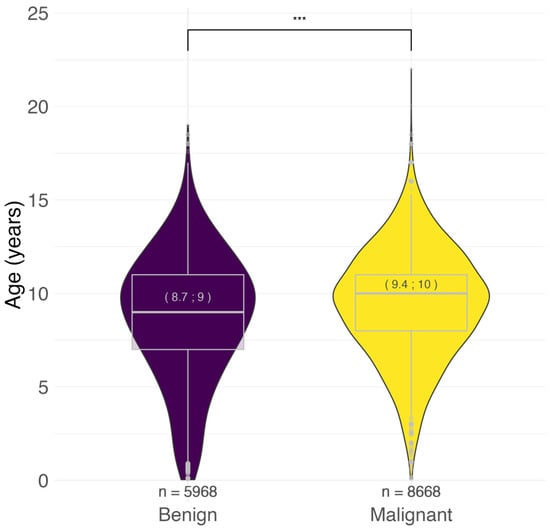 Considering the entire dataset, the age at tumor diagnosis ranged from <1 to 22 years. The mean and median ages were lower for benign tumors (8.7 and 9.0 years, respectively) than for malignant tumors (9.4 and 10.0 years) (Figure 1).