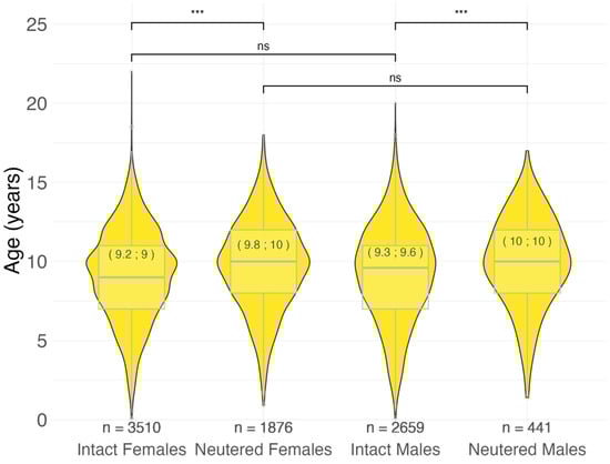 Age at malignant tumor diagnosis by sex and neutering status in 8486 cases. In brackets: mean; median age at diagnosis in years. *** p < 0.001, ns = not significant (p > 0.05), Pairwise Wilcoxon rank sum test. n = number.