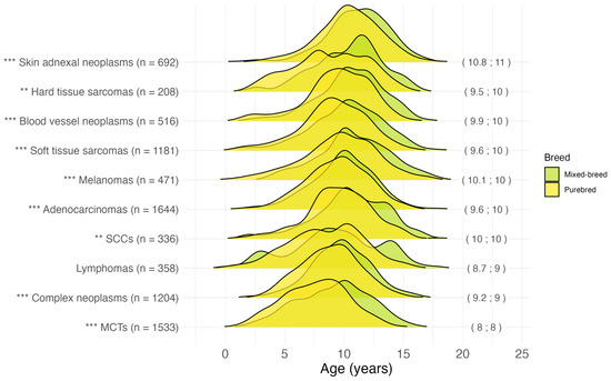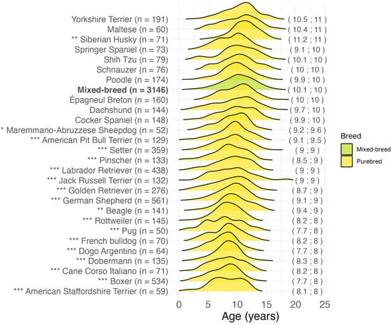 Age at malignant tumor diagnosis for the most common breeds (>50 cases) in 7671 cases. In brackets on the right: mean; median age at diagnosis in years. * p < 0.05, ** p < 0.01, *** p < 0.001, Dunn’s test for “purebred” vs. “mixed-breed” comparison. n = number.