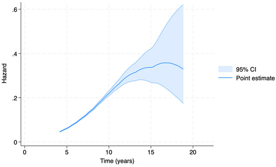The results of the AFT model are shown in Figure 5. The estimated hazard function shows the highest value between 13 and 17 years of age. The 95% confidence interval then widens due to the small number of geriatric individuals who received their first tumor diagnosis after the age of 15.