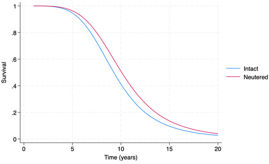 Accelerated Failure Time (AFT) model-generated estimated survival functions in respect to malignant tumor diagnosis in female dogs, providing a comparison of intact (blue line) vs. neutered (red line) female dogs.
