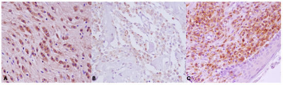 Immunohistochemistry for the evaluation of KIT expression patterns was performed using a well-established protocol described elsewhere [18]. Briefly, 4 μm thick sections of formalin-fixed and paraffin-embedded canine MCTs were mounted on silane-coated glass slides (Bio-Optica, Milan, Italy). A heat-induced epitope retrieval (HIER) was performed as an antigen retrieval pretreatment, submerging the slides in citrate buffer pH 6.0 (Bio-Optica, Milan, Italy) for 20 min at 98 °C. Next, endogenous peroxidase (EP) activity was reduced using 3% hydrogen peroxide (H2O2) in methanol. Then, the sections were treated with a protein block (MACH1, Biocare Medical LLC, Concord, CA, USA) for 30 min each. The slides were incubated overnight at 4 °C with the primary antibody diluted 1:200 in PBS (0.01 M PBS, pH 7,2). The primary antibody used for the study was Polyclonal Rabbit Anti-Human CD117/KIT (DAKO, Dako Italia S.p.A. Via Piero Gobetti, Milan, Italy). A DAB chromogen diluted in a DAB substrate buffer was used to visualize the antigen-antibody reaction, and the slides were counterstained with hematoxylin. Between all incubation steps, the slides were washed two times (5 min each) in PBS. The primary antibody was either omitted or substituted with a 1:20 dilution of rabbit serum (Code 011-000-120, Jackson Immuno Research, 872 West Baltimore Pike, West Grove, PA, USA) for the negative control sections. According to the method of Webster et al., we identified 3 patterns of KIT protein localization, as previously described for canine cutaneous MCTs [7,18]. The MCTs chosen for this study presented strong expression of KIT in at least 10% (estimated based on 100 neoplastic cells in a high-power field) of the neoplastic cells. Cells on the margins of the tissue sections were not considered due to possible artifactual staining.