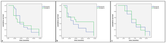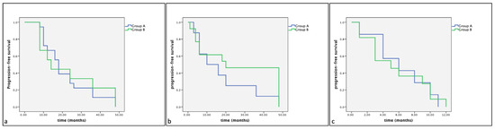 However, a statistically significant difference in cumulative survival times and progression-free survival (p < 0.05) was observed between the different KIT expression patterns. Indeed, the Kaplan–Meier and log-rank tests displayed a significantly shorter cumulative survival and progression-free survival in Group A in dogs showing KIT expression pattern 3 compared to those showing KIT expression pattern 1 (p < 0.01) and KIT expression pattern 2 (p < 0.01) (Figure 4 and Figure 5). Similarly, Group B dogs showed KIT staining pattern 3 compared to dogs showing a KIT pattern 1 (p < 0.01). Furthermore, differences were observed between KIT pattern 3 and KIT pattern 2 in the same assessed group (p < 0.05) (Figure 6 and Figure 7).