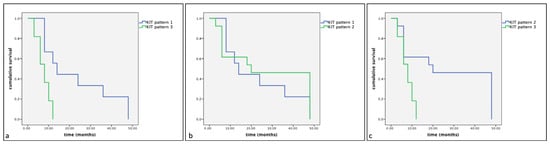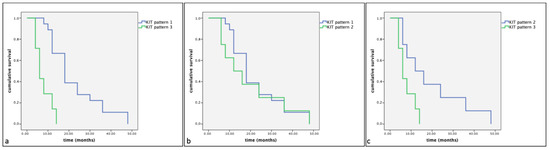 Kaplan–Meier survival graph comparing the three KIT staining patterns in term of cumulative survival times in dogs with MCTs treated post-surgery with TKI therapy. (a) KIT pattern 1 vs. KIT pattern 3; (b) KIT pattern 1 vs. KIT pattern 2; (c) KIT pattern 2 vs. KIT pattern 3.